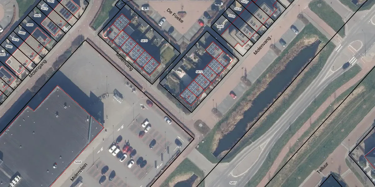 Het perceel waarop Molenvang 24 staat heeft een oppervlakte van 881 m². Dit is een groot perceel. De perceeloppervlakte wordt geregistreerd door het Kadaster. Gedetailleerde informatie over de maten van dit perceel kunt u vinden in het rapport Kadastrale kaart met maatvoering van Molenvang 24.