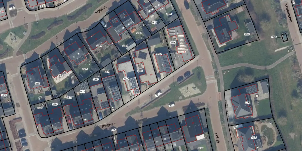 Het perceel waarop Platina 15 staat heeft een oppervlakte van 382 m². Dit is een groot perceel. De perceeloppervlakte wordt geregistreerd door het Kadaster. Gedetailleerde informatie over de maten van dit perceel kunt u vinden in het rapport Kadastrale kaart met maatvoering van Platina 15.