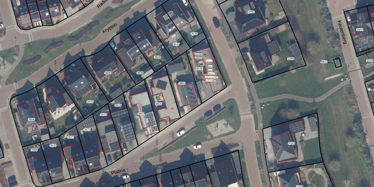 Het perceel waarop Platina 17 staat heeft een oppervlakte van 381 m². Dit is een groot perceel. De perceeloppervlakte wordt geregistreerd door het Kadaster. Gedetailleerde informatie over de maten van dit perceel kunt u vinden in het rapport Kadastrale kaart met maatvoering van Platina 17.