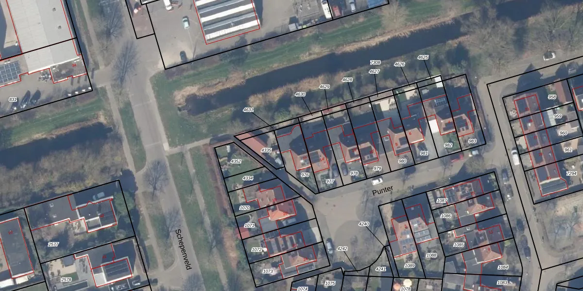 Het perceel waarop Punter 16 staat heeft een oppervlakte van 185 m². Dit is een middelgroot perceel. De perceeloppervlakte wordt geregistreerd door het Kadaster. Gedetailleerde informatie over de maten van dit perceel kunt u vinden in het rapport Kadastrale kaart met maatvoering van Punter 16.