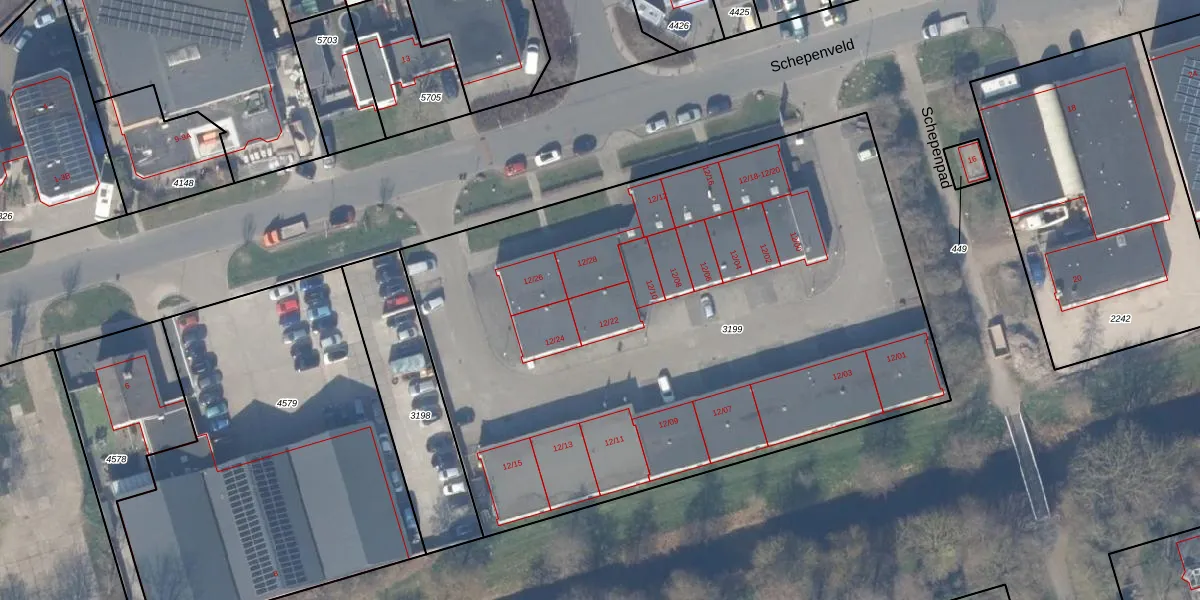 Het perceel waarop Schepenveld 12-22 staat heeft een oppervlakte van 4056 m². Dit is een zeer groot perceel. De perceeloppervlakte wordt geregistreerd door het Kadaster. Gedetailleerde informatie over de maten van dit perceel kunt u vinden in het rapport Kadastrale kaart met maatvoering van Schepenveld 12-22.