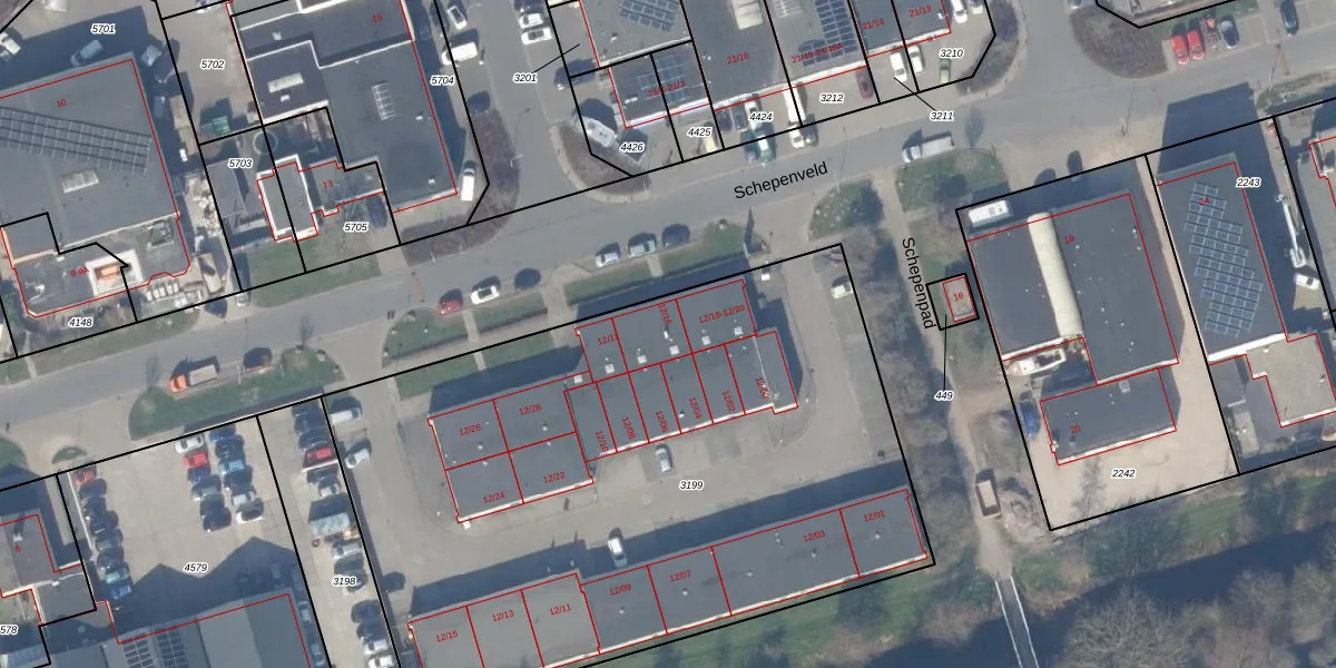 Het perceel waarop Schepenveld 12-16 staat heeft een oppervlakte van 4056 m². Dit is een zeer groot perceel. De perceeloppervlakte wordt geregistreerd door het Kadaster. Gedetailleerde informatie over de maten van dit perceel kunt u vinden in het rapport Kadastrale kaart met maatvoering van Schepenveld 12-16.