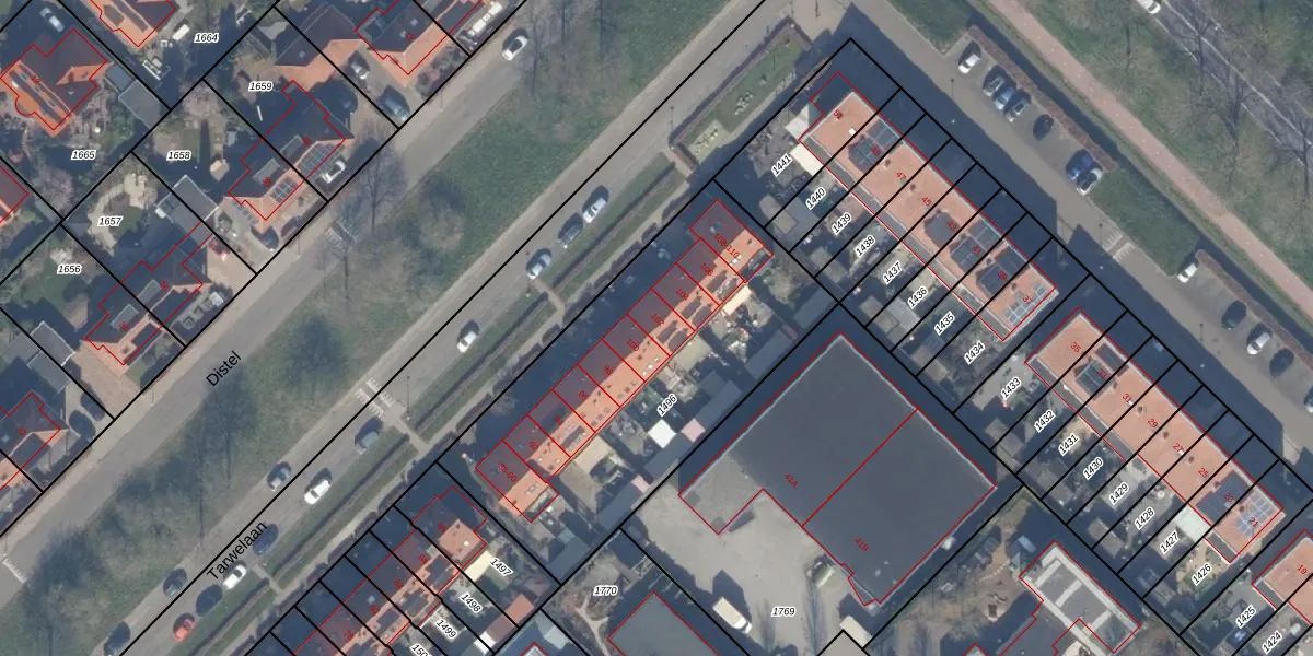 Het perceel waarop Tarwelaan 102 staat heeft een oppervlakte van 1626 m². Dit is een zeer groot perceel. De perceeloppervlakte wordt geregistreerd door het Kadaster. Gedetailleerde informatie over de maten van dit perceel kunt u vinden in het rapport Kadastrale kaart met maatvoering van Tarwelaan 102.