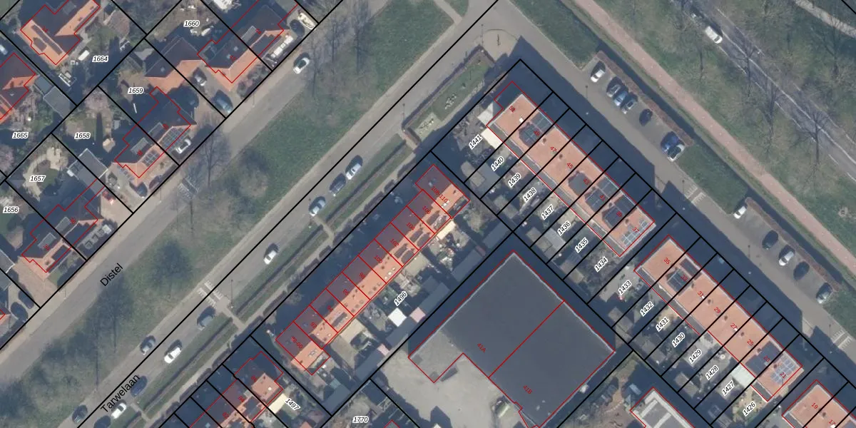 Het perceel waarop Tarwelaan 106 staat heeft een oppervlakte van 1626 m². Dit is een zeer groot perceel. De perceeloppervlakte wordt geregistreerd door het Kadaster. Gedetailleerde informatie over de maten van dit perceel kunt u vinden in het rapport Kadastrale kaart met maatvoering van Tarwelaan 106.