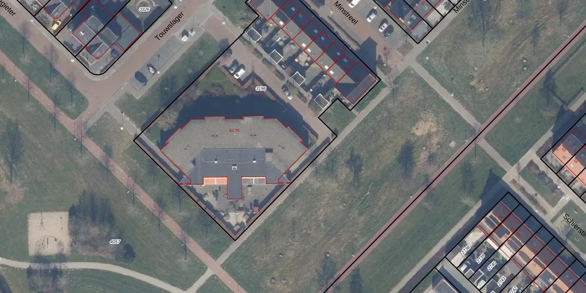 Het perceel waarop Touwslager 64 staat heeft een oppervlakte van 3512 m². Dit is een zeer groot perceel. De perceeloppervlakte wordt geregistreerd door het Kadaster. Gedetailleerde informatie over de maten van dit perceel kunt u vinden in het rapport Kadastrale kaart met maatvoering van Touwslager 64.