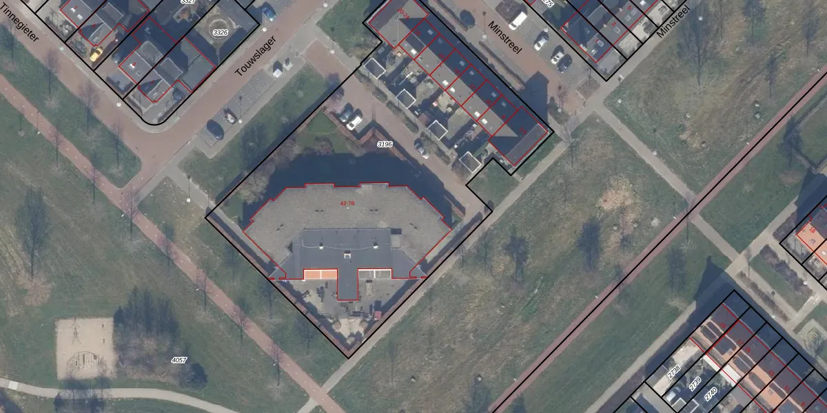 Het perceel waarop Touwslager 66 staat heeft een oppervlakte van 3512 m². Dit is een zeer groot perceel. De perceeloppervlakte wordt geregistreerd door het Kadaster. Gedetailleerde informatie over de maten van dit perceel kunt u vinden in het rapport Kadastrale kaart met maatvoering van Touwslager 66.