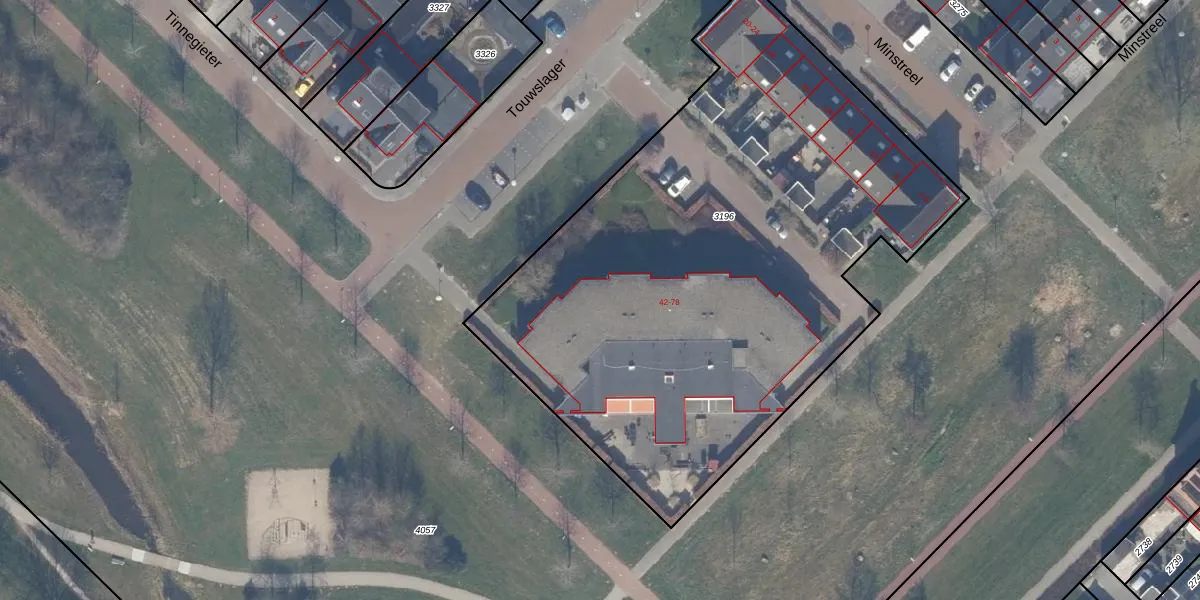 Het perceel waarop Touwslager 74 staat heeft een oppervlakte van 3512 m². Dit is een zeer groot perceel. De perceeloppervlakte wordt geregistreerd door het Kadaster. Gedetailleerde informatie over de maten van dit perceel kunt u vinden in het rapport Kadastrale kaart met maatvoering van Touwslager 74.