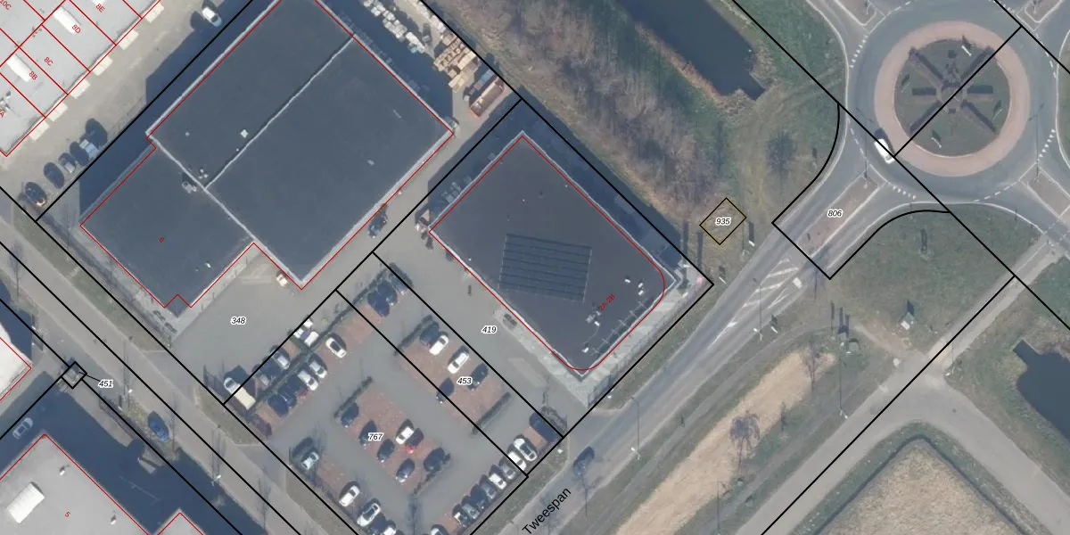 Het perceel waarop Tweespan 2-B staat heeft een oppervlakte van 1998 m². Dit is een zeer groot perceel. De perceeloppervlakte wordt geregistreerd door het Kadaster. Gedetailleerde informatie over de maten van dit perceel kunt u vinden in het rapport Kadastrale kaart met maatvoering van Tweespan 2-B.