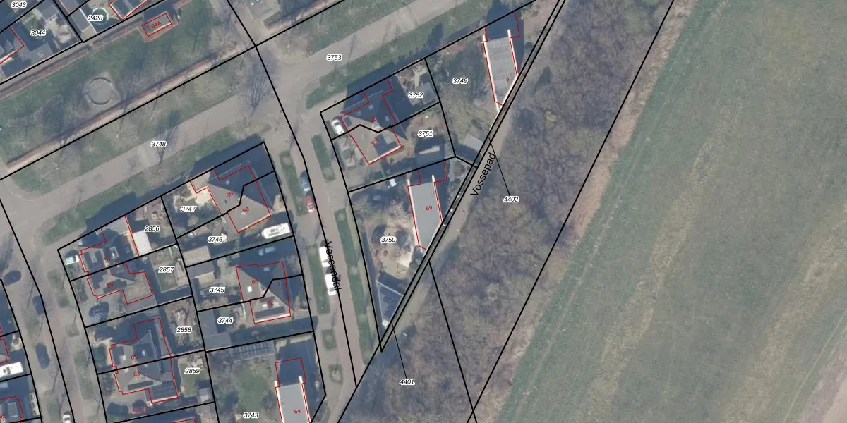 Vossendal 59 is gelegen op kadastraal perceel ZWD03A3750. Deze kadastrale aanduiding is uniek en wordt gebruikt door het Kadaster om eigendomsrechten en andere zakelijke rechten vast te leggen. Het perceel maakt onderdeel uit van de kadastrale gemeente Zeewolde.