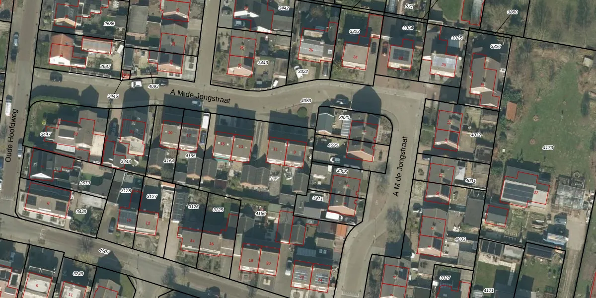 Het perceel waarop A M de Jongstraat 9 staat heeft een oppervlakte van 1986 m². Dit is een zeer groot perceel. De perceeloppervlakte wordt geregistreerd door het Kadaster. Gedetailleerde informatie over de maten van dit perceel kunt u vinden in het rapport Kadastrale kaart met maatvoering van A M de Jongstraat 9.