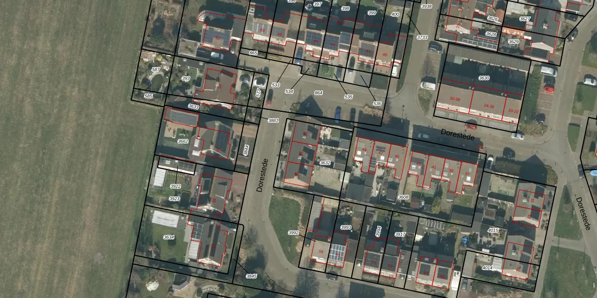 Het perceel waarop Dorestede 53 staat heeft een oppervlakte van 521 m². Dit is een groot perceel. De perceeloppervlakte wordt geregistreerd door het Kadaster. Gedetailleerde informatie over de maten van dit perceel kunt u vinden in het rapport Kadastrale kaart met maatvoering van Dorestede 53.