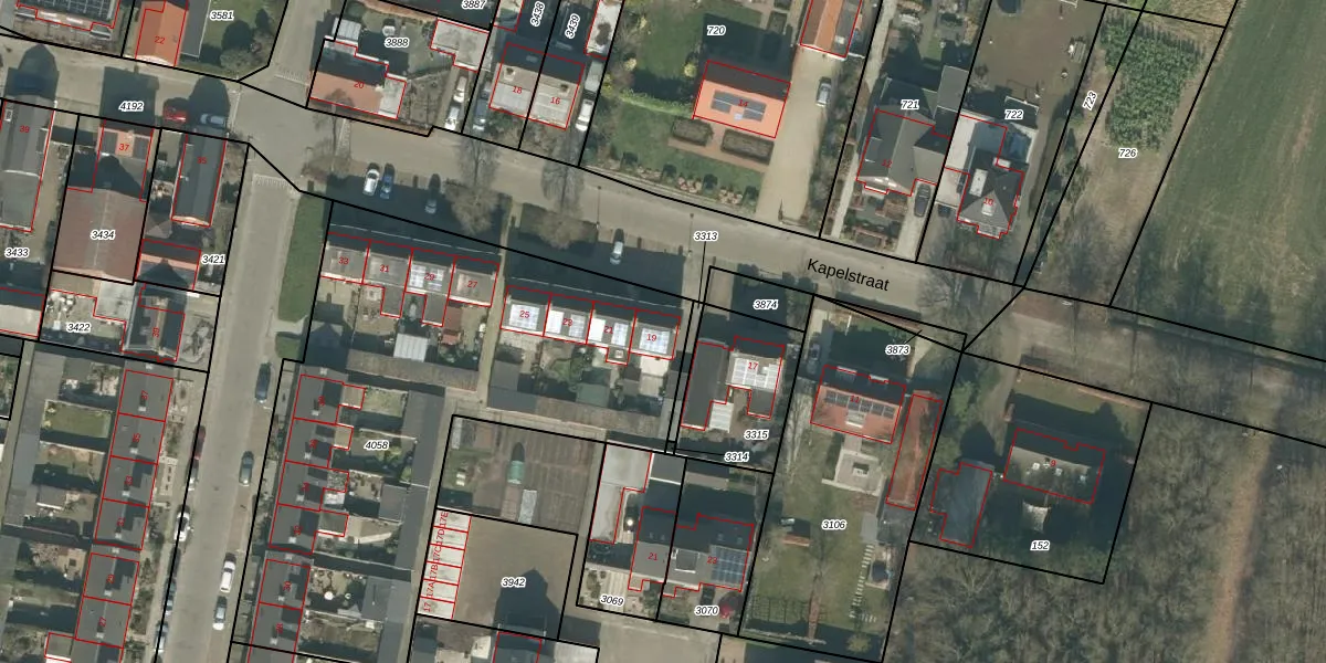 Het perceel waarop Kapelstraat 19 staat heeft een oppervlakte van 2525 m². Dit is een zeer groot perceel. De perceeloppervlakte wordt geregistreerd door het Kadaster. Gedetailleerde informatie over de maten van dit perceel kunt u vinden in het rapport Kadastrale kaart met maatvoering van Kapelstraat 19.