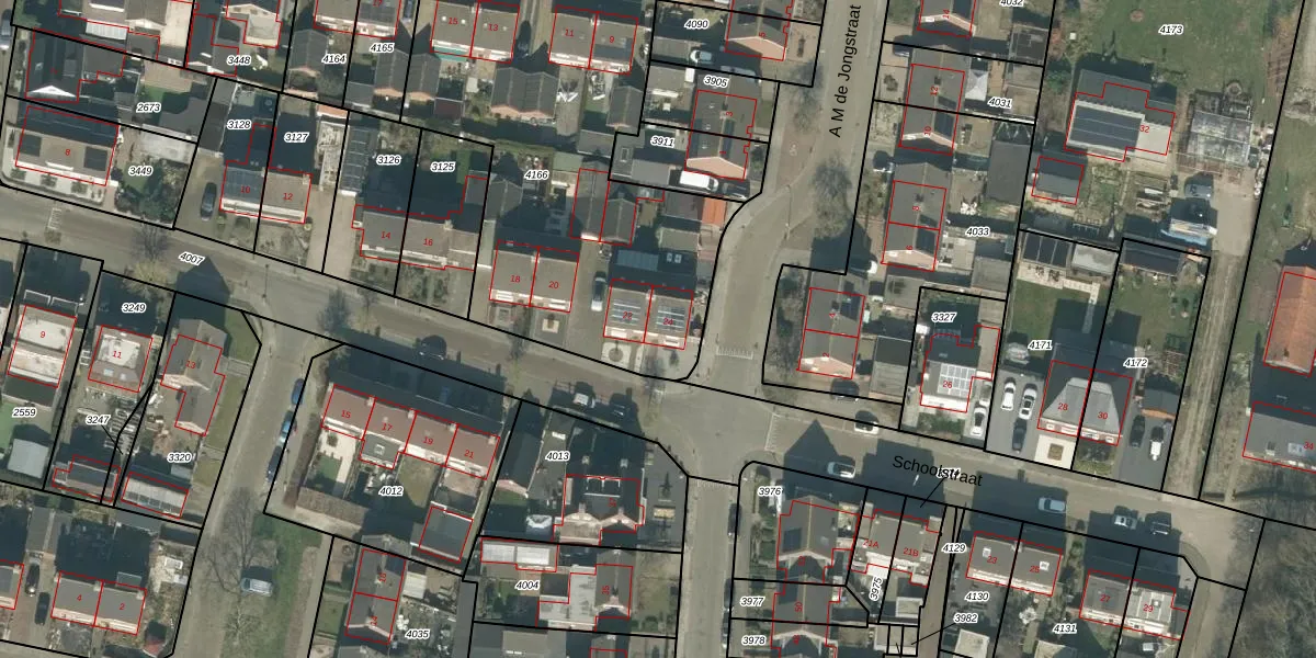 Het perceel waarop Schoolstraat 24 staat heeft een oppervlakte van 1986 m². Dit is een zeer groot perceel. De perceeloppervlakte wordt geregistreerd door het Kadaster. Gedetailleerde informatie over de maten van dit perceel kunt u vinden in het rapport Kadastrale kaart met maatvoering van Schoolstraat 24.