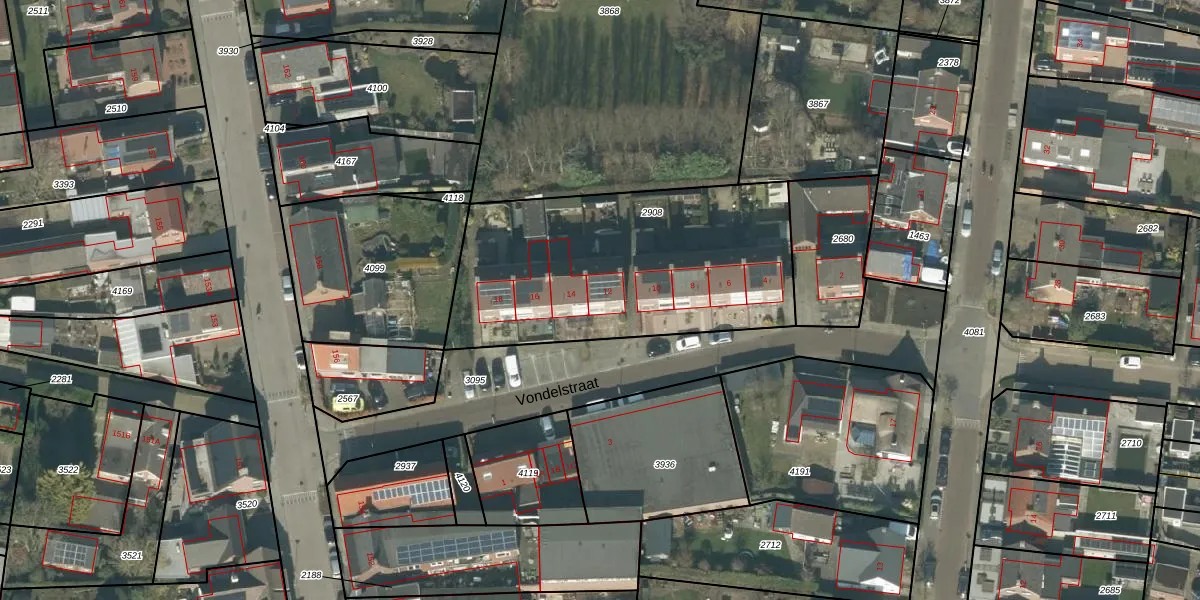 Vondelstraat 12 is gelegen op kadastraal perceel RPN00A2908. Deze kadastrale aanduiding is uniek en wordt gebruikt door het Kadaster om eigendomsrechten en andere zakelijke rechten vast te leggen. Het perceel maakt onderdeel uit van de kadastrale gemeente Rucphen.