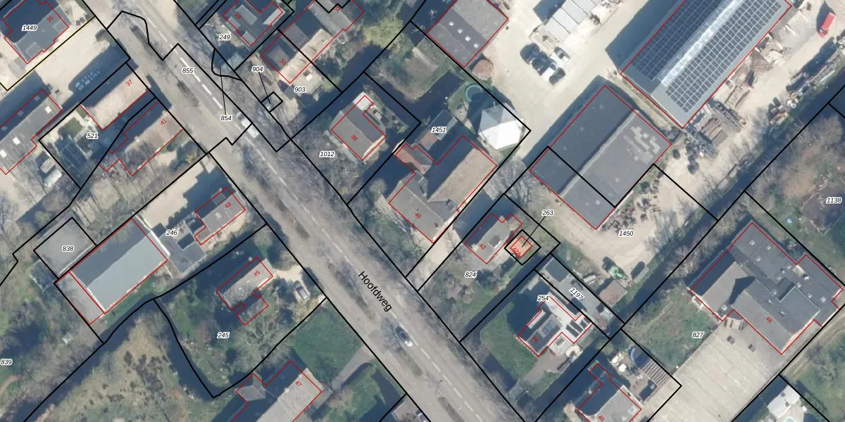 Het perceel waarop Hoofdweg 40 staat heeft een oppervlakte van 1225 m². Dit is een zeer groot perceel. De perceeloppervlakte wordt geregistreerd door het Kadaster. Gedetailleerde informatie over de maten van dit perceel kunt u vinden in het rapport Kadastrale kaart met maatvoering van Hoofdweg 40.