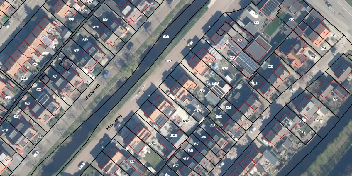 Het perceel waarop Molenweg 12 staat heeft een oppervlakte van 293 m². Dit is een middelgroot perceel. De perceeloppervlakte wordt geregistreerd door het Kadaster. Gedetailleerde informatie over de maten van dit perceel kunt u vinden in het rapport Kadastrale kaart met maatvoering van Molenweg 12.