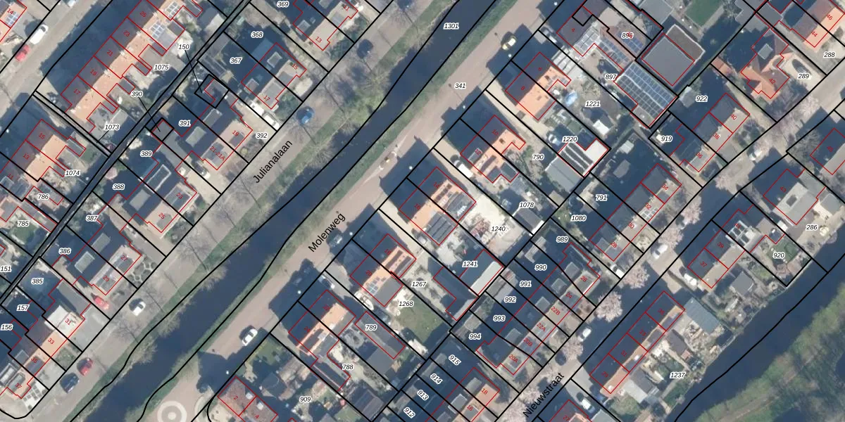 Het perceel waarop Molenweg 16 staat heeft een oppervlakte van 310 m². Dit is een groot perceel. De perceeloppervlakte wordt geregistreerd door het Kadaster. Gedetailleerde informatie over de maten van dit perceel kunt u vinden in het rapport Kadastrale kaart met maatvoering van Molenweg 16.
