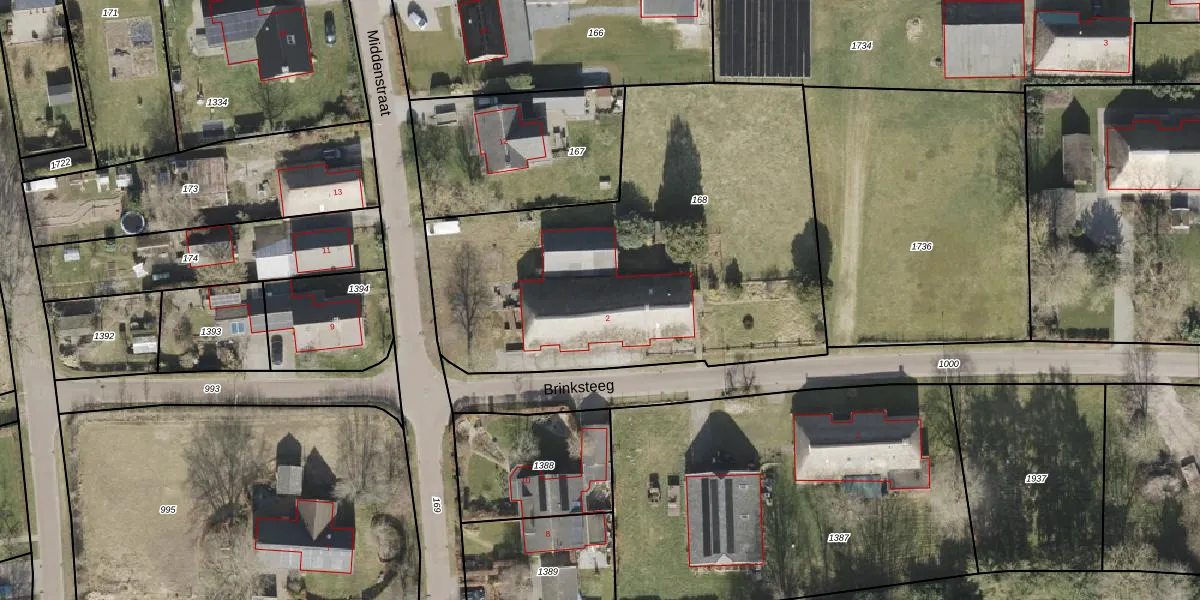 Brinksteeg 2 is gelegen op kadastraal perceel VRI00U168. Deze kadastrale aanduiding is uniek en wordt gebruikt door het Kadaster om eigendomsrechten en andere zakelijke rechten vast te leggen. Het perceel maakt onderdeel uit van de kadastrale gemeente Vries.