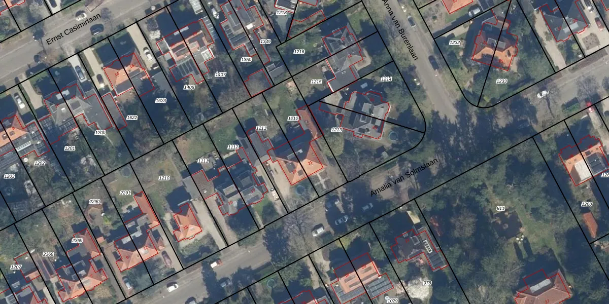 Het perceel waarop Amalia van Solmslaan 21 staat heeft een oppervlakte van 434 m². Dit is een groot perceel. De perceeloppervlakte wordt geregistreerd door het Kadaster. Gedetailleerde informatie over de maten van dit perceel kunt u vinden in het rapport Kadastrale kaart met maatvoering van Amalia van Solmslaan 21.