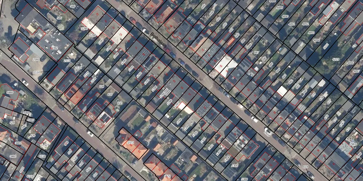 Het perceel waarop Bothalaan 59 staat heeft een oppervlakte van 174 m². Dit is een middelgroot perceel. De perceeloppervlakte wordt geregistreerd door het Kadaster. Gedetailleerde informatie over de maten van dit perceel kunt u vinden in het rapport Kadastrale kaart met maatvoering van Bothalaan 59.