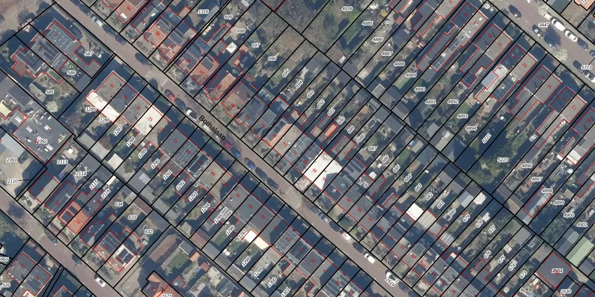 Het perceel waarop Bothalaan 70 staat heeft een oppervlakte van 182 m². Dit is een middelgroot perceel. De perceeloppervlakte wordt geregistreerd door het Kadaster. Gedetailleerde informatie over de maten van dit perceel kunt u vinden in het rapport Kadastrale kaart met maatvoering van Bothalaan 70.