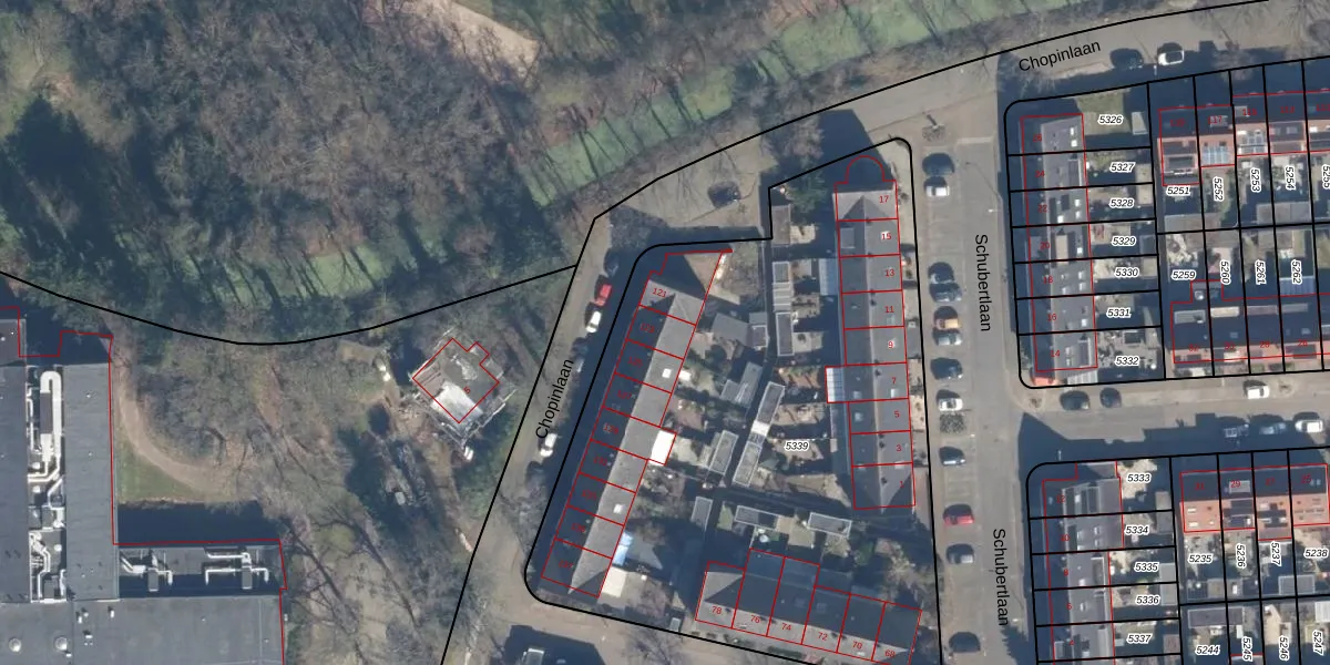 Het perceel waarop Chopinlaan 123 staat heeft een oppervlakte van 3507 m². Dit is een zeer groot perceel. De perceeloppervlakte wordt geregistreerd door het Kadaster. Gedetailleerde informatie over de maten van dit perceel kunt u vinden in het rapport Kadastrale kaart met maatvoering van Chopinlaan 123.