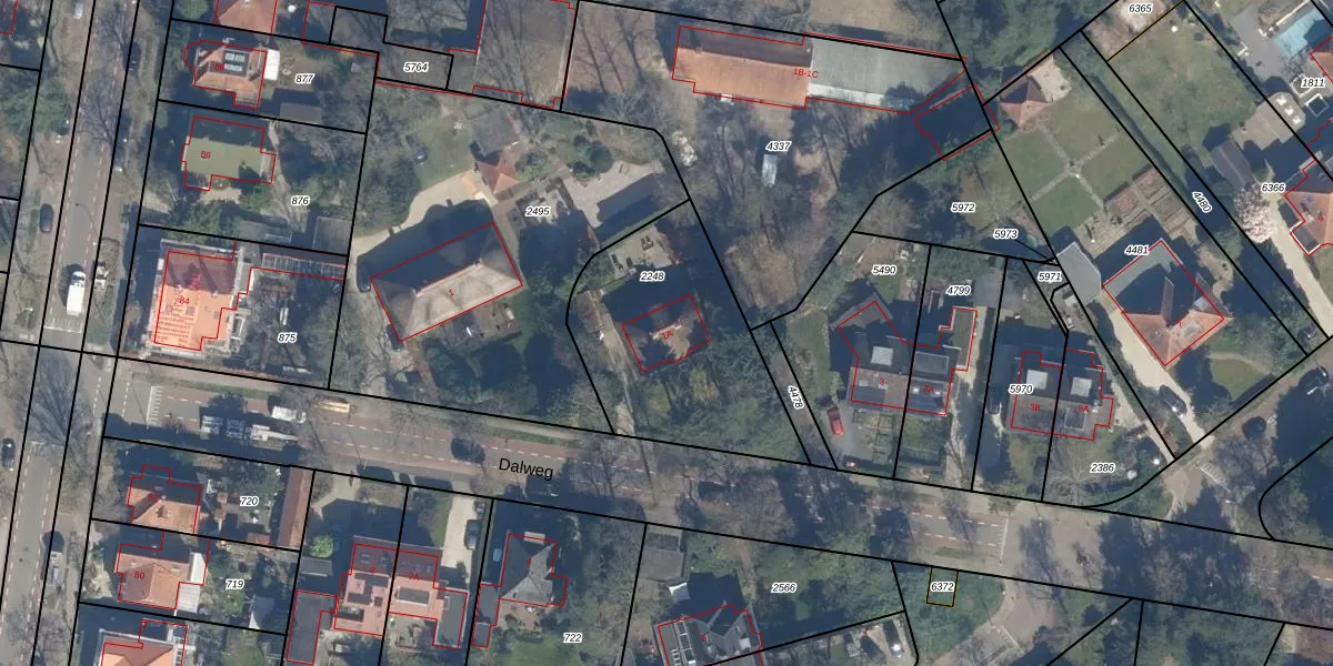 Het perceel waarop Dalweg 1-A staat heeft een oppervlakte van 835 m². Dit is een groot perceel. De perceeloppervlakte wordt geregistreerd door het Kadaster. Gedetailleerde informatie over de maten van dit perceel kunt u vinden in het rapport Kadastrale kaart met maatvoering van Dalweg 1-A.