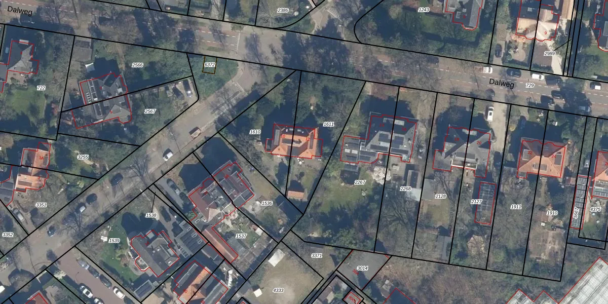 Het perceel waarop Dalweg 12 staat heeft een oppervlakte van 625 m². Dit is een groot perceel. De perceeloppervlakte wordt geregistreerd door het Kadaster. Gedetailleerde informatie over de maten van dit perceel kunt u vinden in het rapport Kadastrale kaart met maatvoering van Dalweg 12.