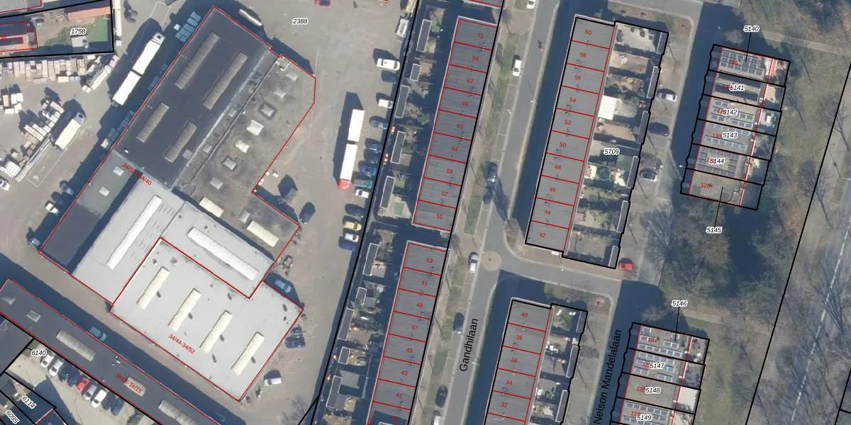 Het perceel waarop Gandhilaan 55 staat heeft een oppervlakte van 4720 m². Dit is een zeer groot perceel. De perceeloppervlakte wordt geregistreerd door het Kadaster. Gedetailleerde informatie over de maten van dit perceel kunt u vinden in het rapport Kadastrale kaart met maatvoering van Gandhilaan 55.