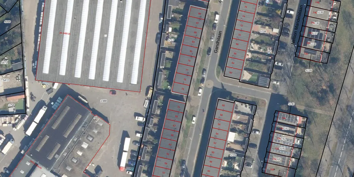 Het perceel waarop Gandhilaan 73 staat heeft een oppervlakte van 4720 m². Dit is een zeer groot perceel. De perceeloppervlakte wordt geregistreerd door het Kadaster. Gedetailleerde informatie over de maten van dit perceel kunt u vinden in het rapport Kadastrale kaart met maatvoering van Gandhilaan 73.