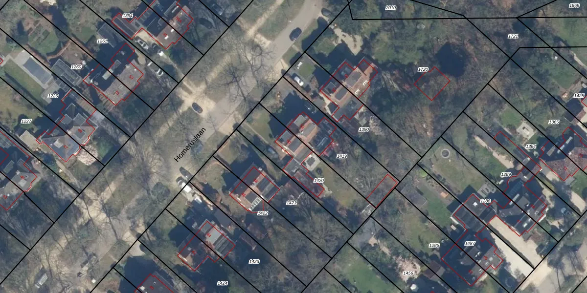 Homeruslaan 50 is gelegen op kadastraal perceel ZEI00I1420. Deze kadastrale aanduiding is uniek en wordt gebruikt door het Kadaster om eigendomsrechten en andere zakelijke rechten vast te leggen. Het perceel maakt onderdeel uit van de kadastrale gemeente Zeist.