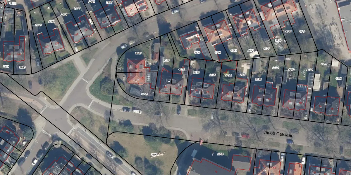 Het perceel waarop Jacob Catslaan 76 staat heeft een oppervlakte van 267 m². Dit is een middelgroot perceel. De perceeloppervlakte wordt geregistreerd door het Kadaster. Gedetailleerde informatie over de maten van dit perceel kunt u vinden in het rapport Kadastrale kaart met maatvoering van Jacob Catslaan 76.