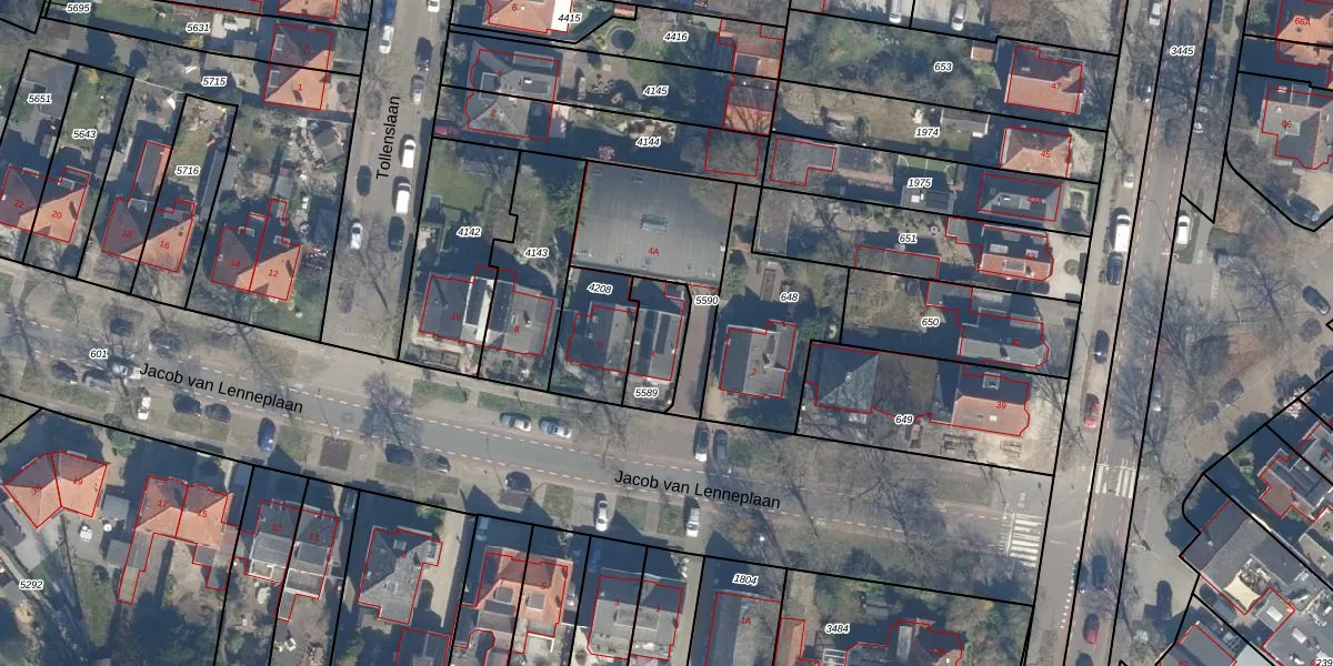 Jacob van Lenneplaan 4 is gelegen op kadastraal perceel ZEI00M5589. Deze kadastrale aanduiding is uniek en wordt gebruikt door het Kadaster om eigendomsrechten en andere zakelijke rechten vast te leggen. Het perceel maakt onderdeel uit van de kadastrale gemeente Zeist.