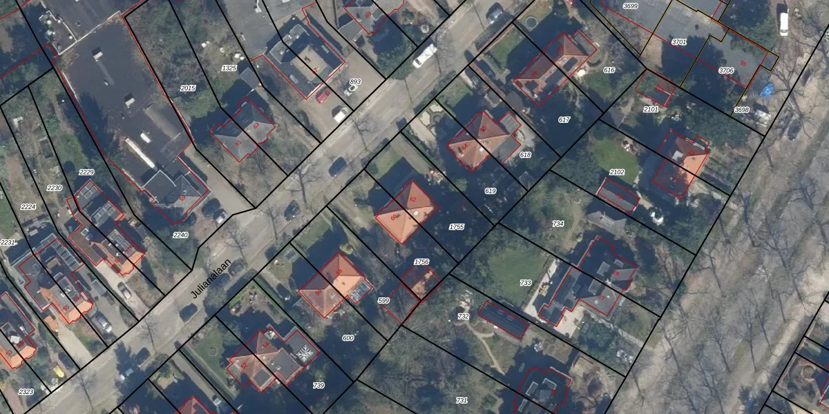 Het perceel waarop Julianalaan 62 staat heeft een oppervlakte van 406 m². Dit is een groot perceel. De perceeloppervlakte wordt geregistreerd door het Kadaster. Gedetailleerde informatie over de maten van dit perceel kunt u vinden in het rapport Kadastrale kaart met maatvoering van Julianalaan 62.