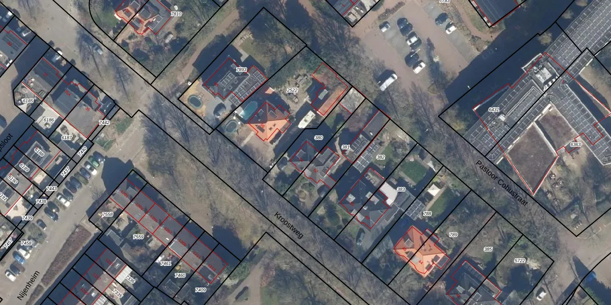 Kroostweg 54 is gelegen op kadastraal perceel ZEI00N380. Deze kadastrale aanduiding is uniek en wordt gebruikt door het Kadaster om eigendomsrechten en andere zakelijke rechten vast te leggen. Het perceel maakt onderdeel uit van de kadastrale gemeente Zeist.
