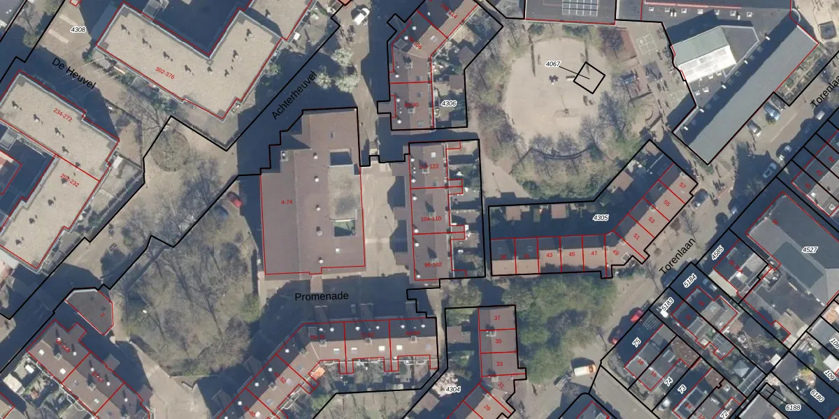 Het perceel waarop Promenade 110 staat heeft een oppervlakte van 1,1 ha. Dit is een zeer groot perceel. De perceeloppervlakte wordt geregistreerd door het Kadaster. Gedetailleerde informatie over de maten van dit perceel kunt u vinden in het rapport Kadastrale kaart met maatvoering van Promenade 110.