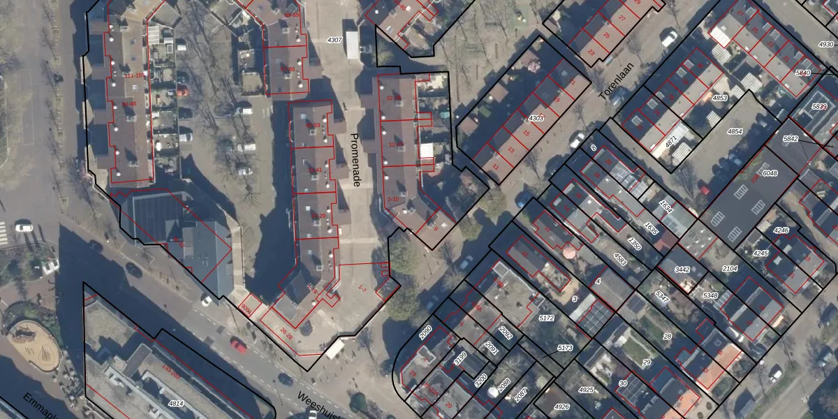 Het perceel waarop Promenade 2 staat heeft een oppervlakte van 1,1 ha. Dit is een zeer groot perceel. De perceeloppervlakte wordt geregistreerd door het Kadaster. Gedetailleerde informatie over de maten van dit perceel kunt u vinden in het rapport Kadastrale kaart met maatvoering van Promenade 2.
