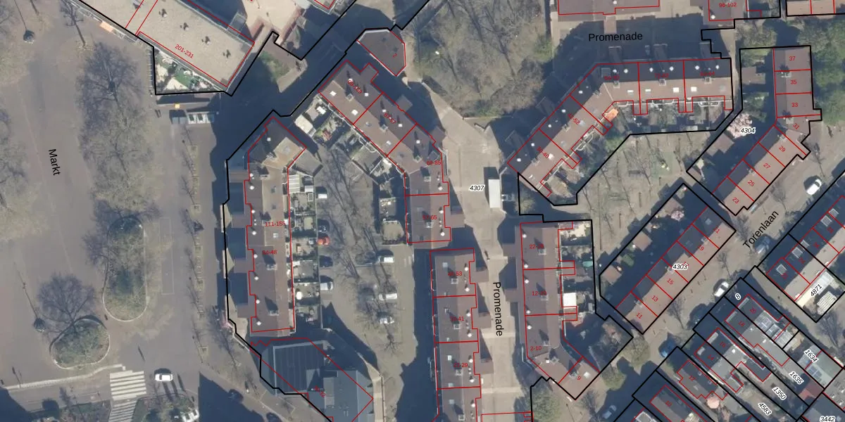 Het perceel waarop Promenade 57 staat heeft een oppervlakte van 1,1 ha. Dit is een zeer groot perceel. De perceeloppervlakte wordt geregistreerd door het Kadaster. Gedetailleerde informatie over de maten van dit perceel kunt u vinden in het rapport Kadastrale kaart met maatvoering van Promenade 57.