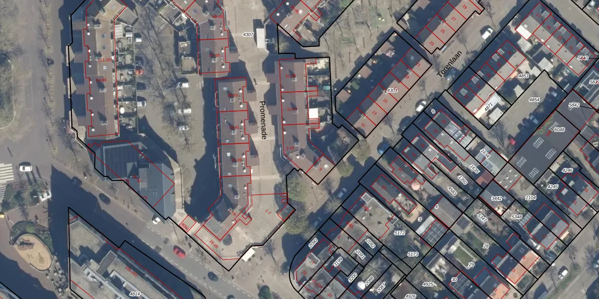 Het perceel waarop Promenade 6 staat heeft een oppervlakte van 1,1 ha. Dit is een zeer groot perceel. De perceeloppervlakte wordt geregistreerd door het Kadaster. Gedetailleerde informatie over de maten van dit perceel kunt u vinden in het rapport Kadastrale kaart met maatvoering van Promenade 6.