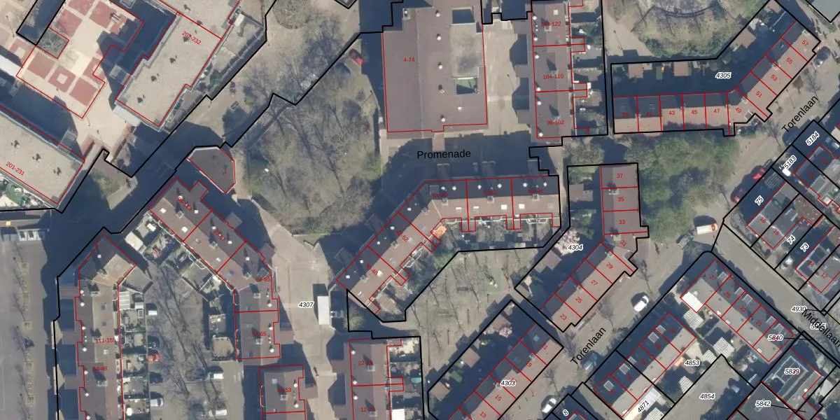 Het perceel waarop Promenade 60 staat heeft een oppervlakte van 1,1 ha. Dit is een zeer groot perceel. De perceeloppervlakte wordt geregistreerd door het Kadaster. Gedetailleerde informatie over de maten van dit perceel kunt u vinden in het rapport Kadastrale kaart met maatvoering van Promenade 60.