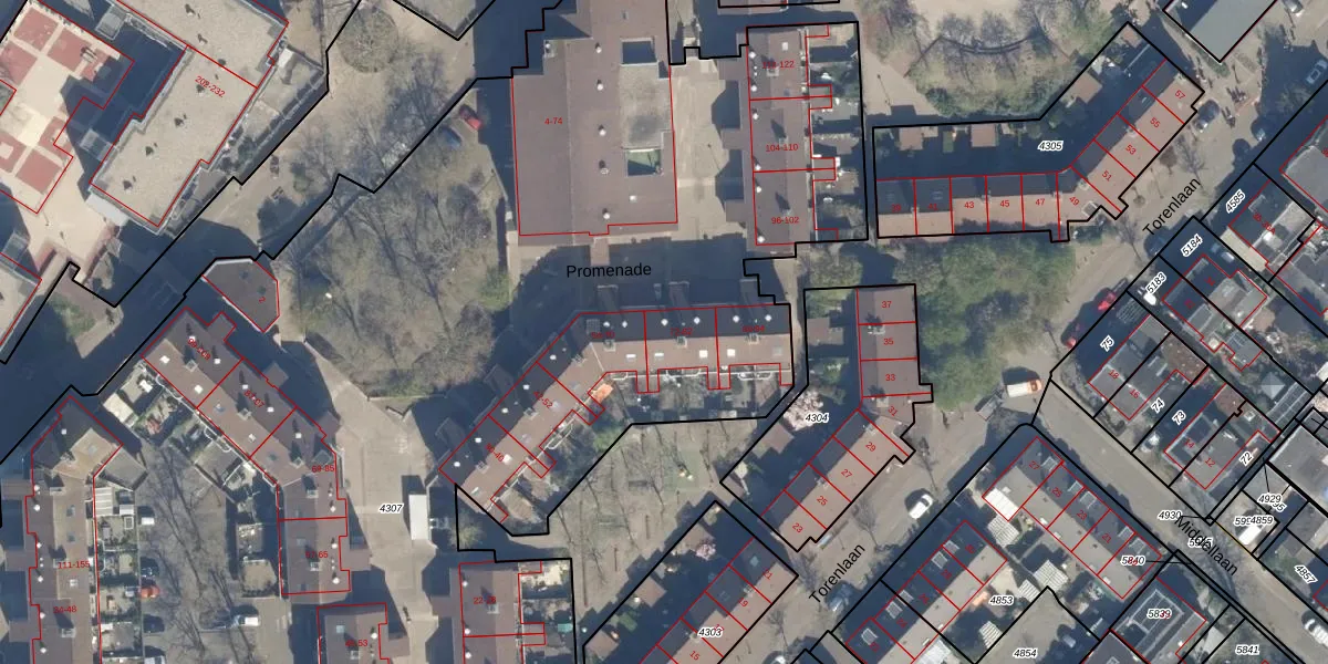 Het perceel waarop Promenade 72 staat heeft een oppervlakte van 1,1 ha. Dit is een zeer groot perceel. De perceeloppervlakte wordt geregistreerd door het Kadaster. Gedetailleerde informatie over de maten van dit perceel kunt u vinden in het rapport Kadastrale kaart met maatvoering van Promenade 72.