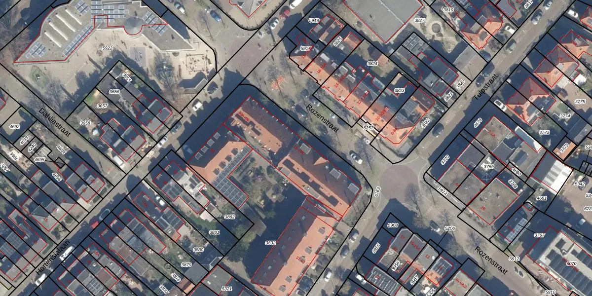 Het perceel waarop Rozenstraat 19-E staat heeft een oppervlakte van 2679 m². Dit is een zeer groot perceel. De perceeloppervlakte wordt geregistreerd door het Kadaster. Gedetailleerde informatie over de maten van dit perceel kunt u vinden in het rapport Kadastrale kaart met maatvoering van Rozenstraat 19-E.