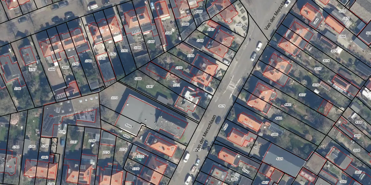 Het perceel waarop Van der Merschlaan 49 staat heeft een oppervlakte van 330 m². Dit is een groot perceel. De perceeloppervlakte wordt geregistreerd door het Kadaster. Gedetailleerde informatie over de maten van dit perceel kunt u vinden in het rapport Kadastrale kaart met maatvoering van Van der Merschlaan 49.