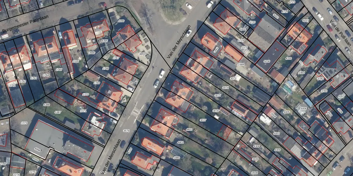 Het perceel waarop Van der Merschlaan 72 staat heeft een oppervlakte van 445 m². Dit is een groot perceel. De perceeloppervlakte wordt geregistreerd door het Kadaster. Gedetailleerde informatie over de maten van dit perceel kunt u vinden in het rapport Kadastrale kaart met maatvoering van Van der Merschlaan 72.