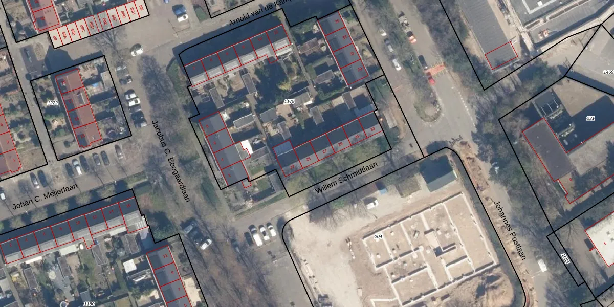 Het perceel waarop Willem Schmidtlaan 25 staat heeft een oppervlakte van 2990 m². Dit is een zeer groot perceel. De perceeloppervlakte wordt geregistreerd door het Kadaster. Gedetailleerde informatie over de maten van dit perceel kunt u vinden in het rapport Kadastrale kaart met maatvoering van Willem Schmidtlaan 25.