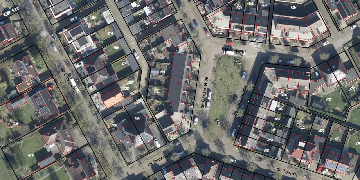 Het perceel waarop de Ganzenebbe 22 staat heeft een oppervlakte van 1524 m². Dit is een zeer groot perceel. De perceeloppervlakte wordt geregistreerd door het Kadaster. Gedetailleerde informatie over de maten van dit perceel kunt u vinden in het rapport Kadastrale kaart met maatvoering van de Ganzenebbe 22.