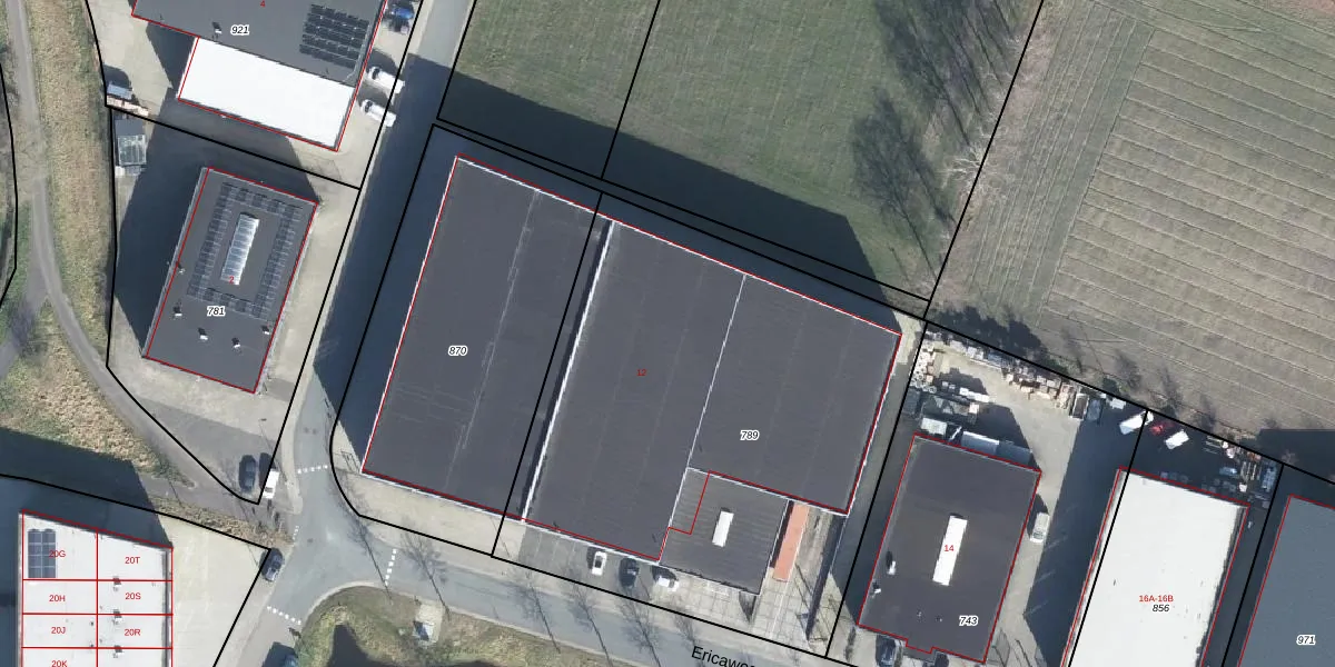 Het perceel waarop Ericaweg 12 staat heeft een oppervlakte van 2872 m². Dit is een zeer groot perceel. De perceeloppervlakte wordt geregistreerd door het Kadaster. Gedetailleerde informatie over de maten van dit perceel kunt u vinden in het rapport Kadastrale kaart met maatvoering van Ericaweg 12.