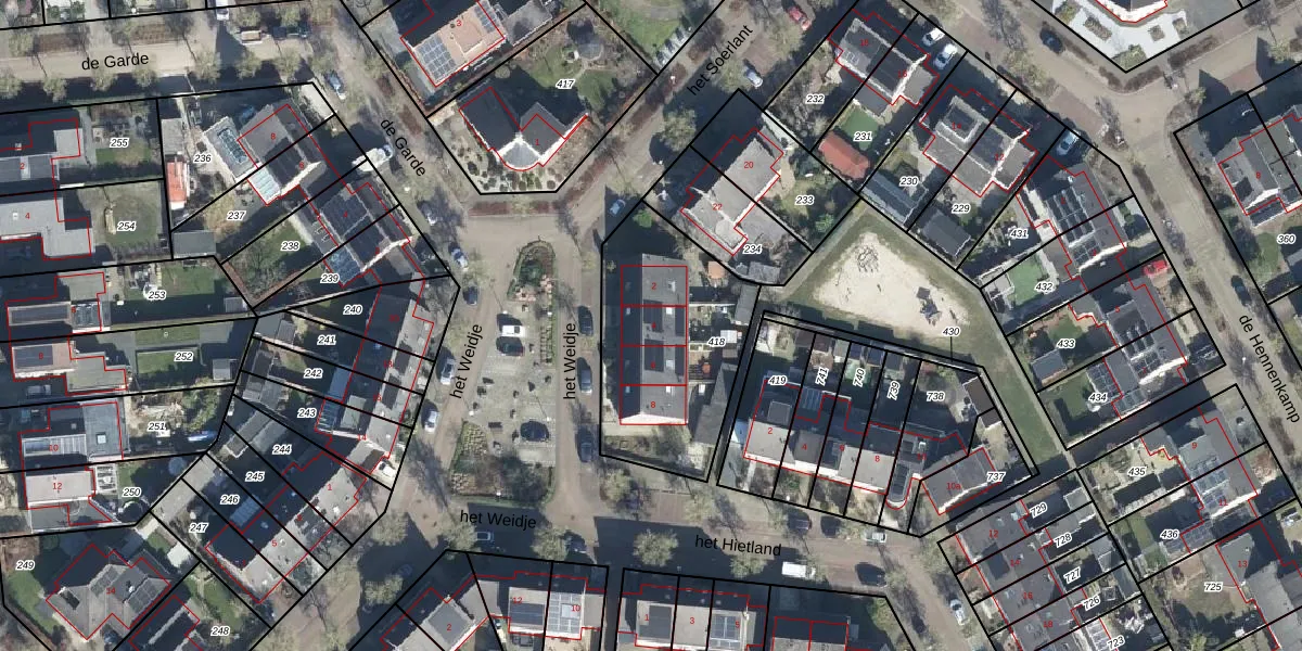 Het perceel waarop het Weidje 4 staat heeft een oppervlakte van 745 m². Dit is een groot perceel. De perceeloppervlakte wordt geregistreerd door het Kadaster. Gedetailleerde informatie over de maten van dit perceel kunt u vinden in het rapport Kadastrale kaart met maatvoering van het Weidje 4.