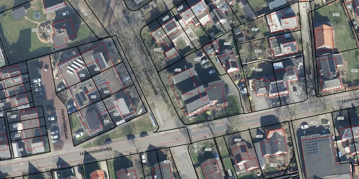 Het perceel waarop Hummeloseweg 37-L staat heeft een oppervlakte van 1245 m². Dit is een zeer groot perceel. De perceeloppervlakte wordt geregistreerd door het Kadaster. Gedetailleerde informatie over de maten van dit perceel kunt u vinden in het rapport Kadastrale kaart met maatvoering van Hummeloseweg 37-L.
