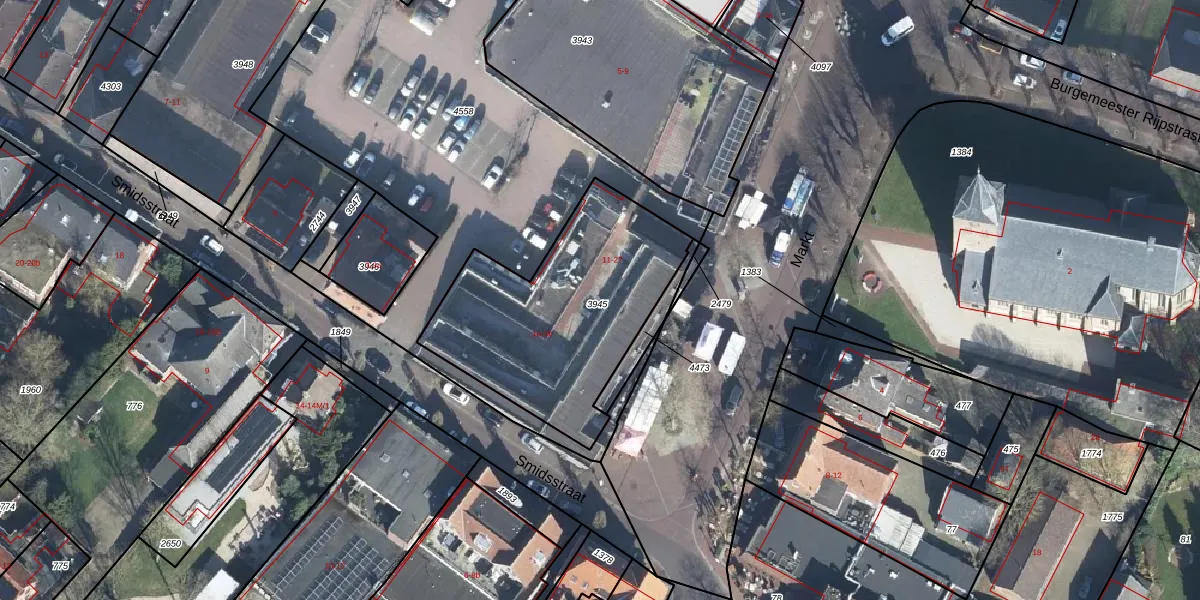 Het perceel waarop Markt 13 staat heeft een oppervlakte van 972 m². Dit is een groot perceel. De perceeloppervlakte wordt geregistreerd door het Kadaster. Gedetailleerde informatie over de maten van dit perceel kunt u vinden in het rapport Kadastrale kaart met maatvoering van Markt 13.